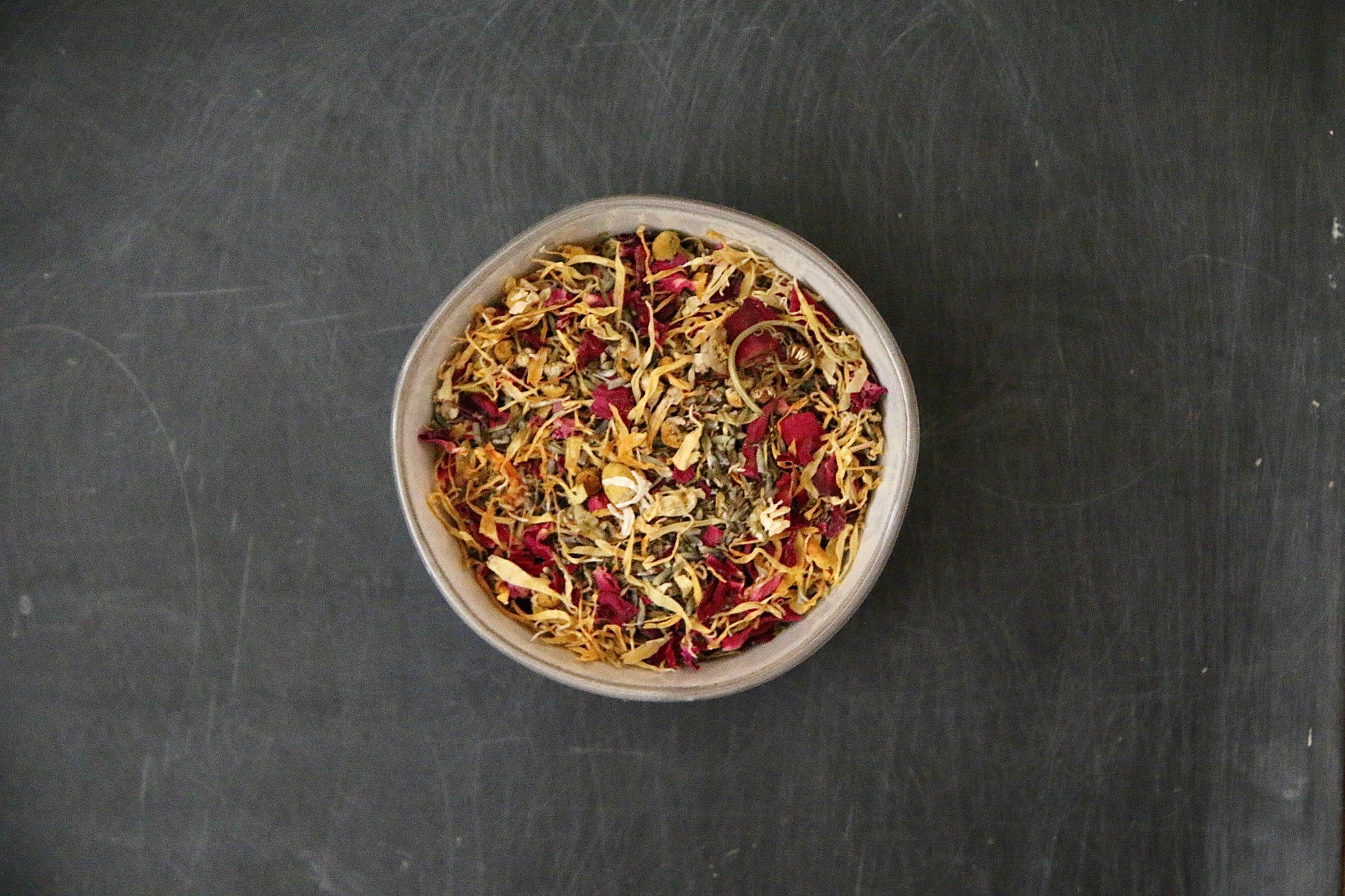 I N G R E D I E N T S : Organic Lemon Balm, Organic Lavender Buds, Organic Rose Petals, Organic Chamomile, Organic Calendula.